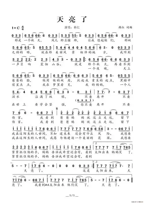 韩红天亮了钢琴谱