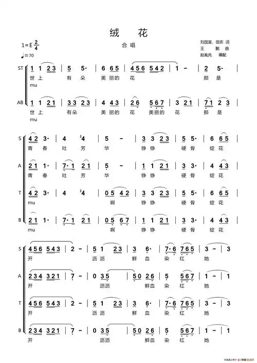 赵胤先声乐曲谱《绒花》(合唱谱"为声乐组合,中小型合唱团 速编")