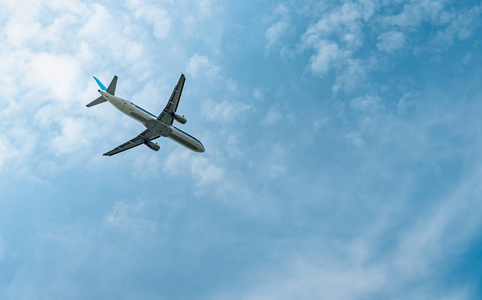 客机在机场起飞,蓝天白云. 离开航班. 开始出国之旅. 假期时间.