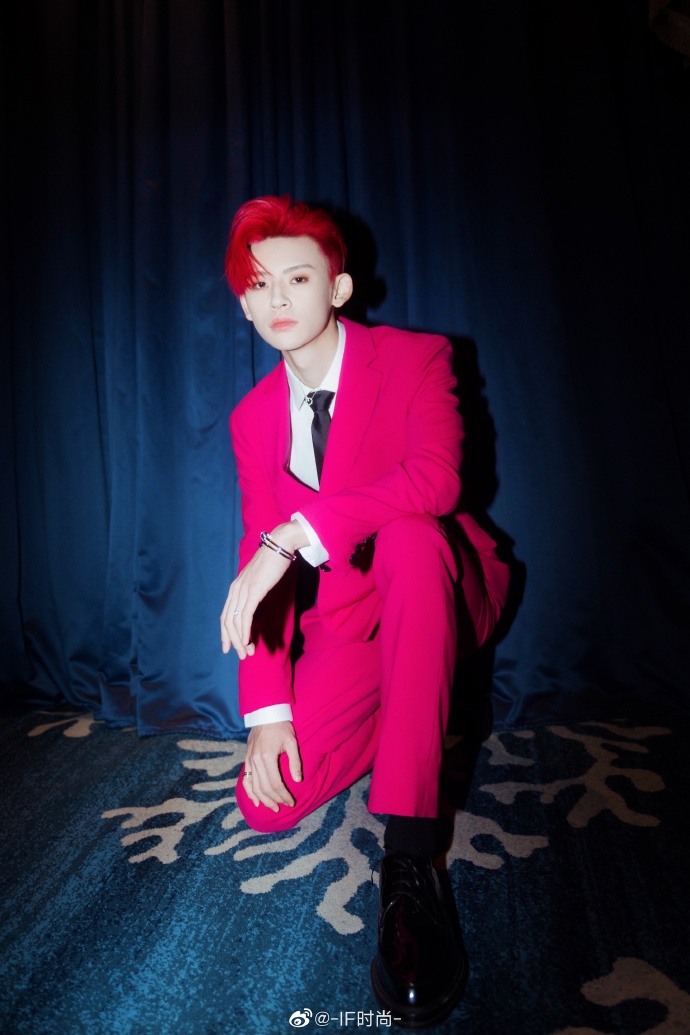 小鬼王琳凯身着玫红色西服套装,靓眼红色发型个性时尚