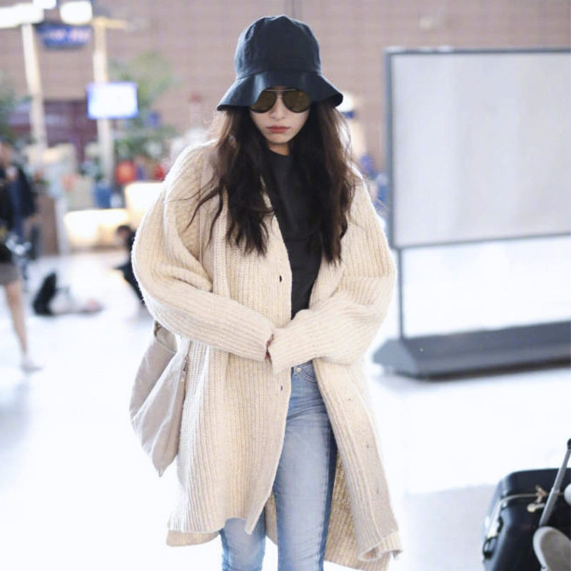 2017秋冬倪妮明星同款毛衣外套女机场街拍港味复古中长款毛针织衫
