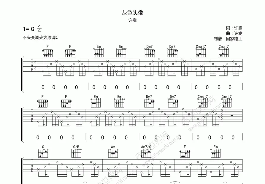 灰色头像吉他谱_许嵩_c调弹唱吉他谱 - 吉他世界