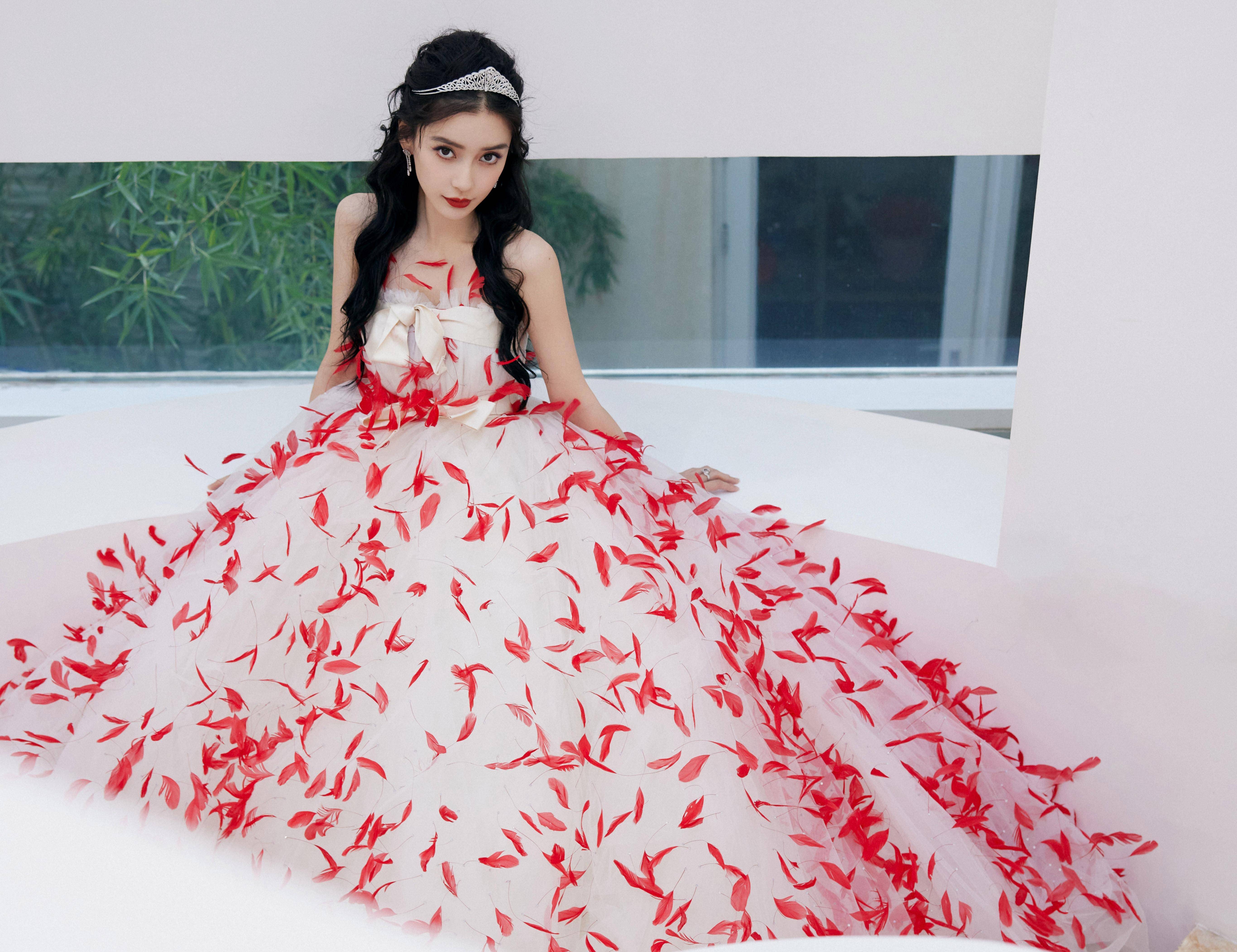 angelababy参加某活动生图曝光,穿粉色抹胸羽毛礼服裙减龄又性感,颜值