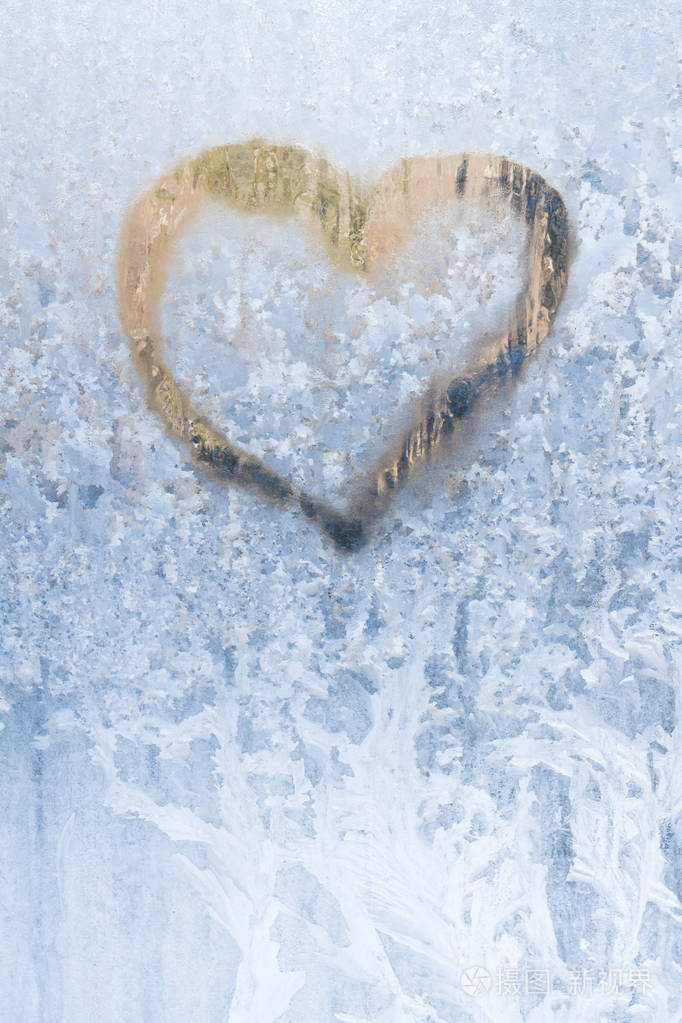 红心结霜,树枝结冰在雪地里.情人节的贺卡.爱情和浪漫关系的象征.