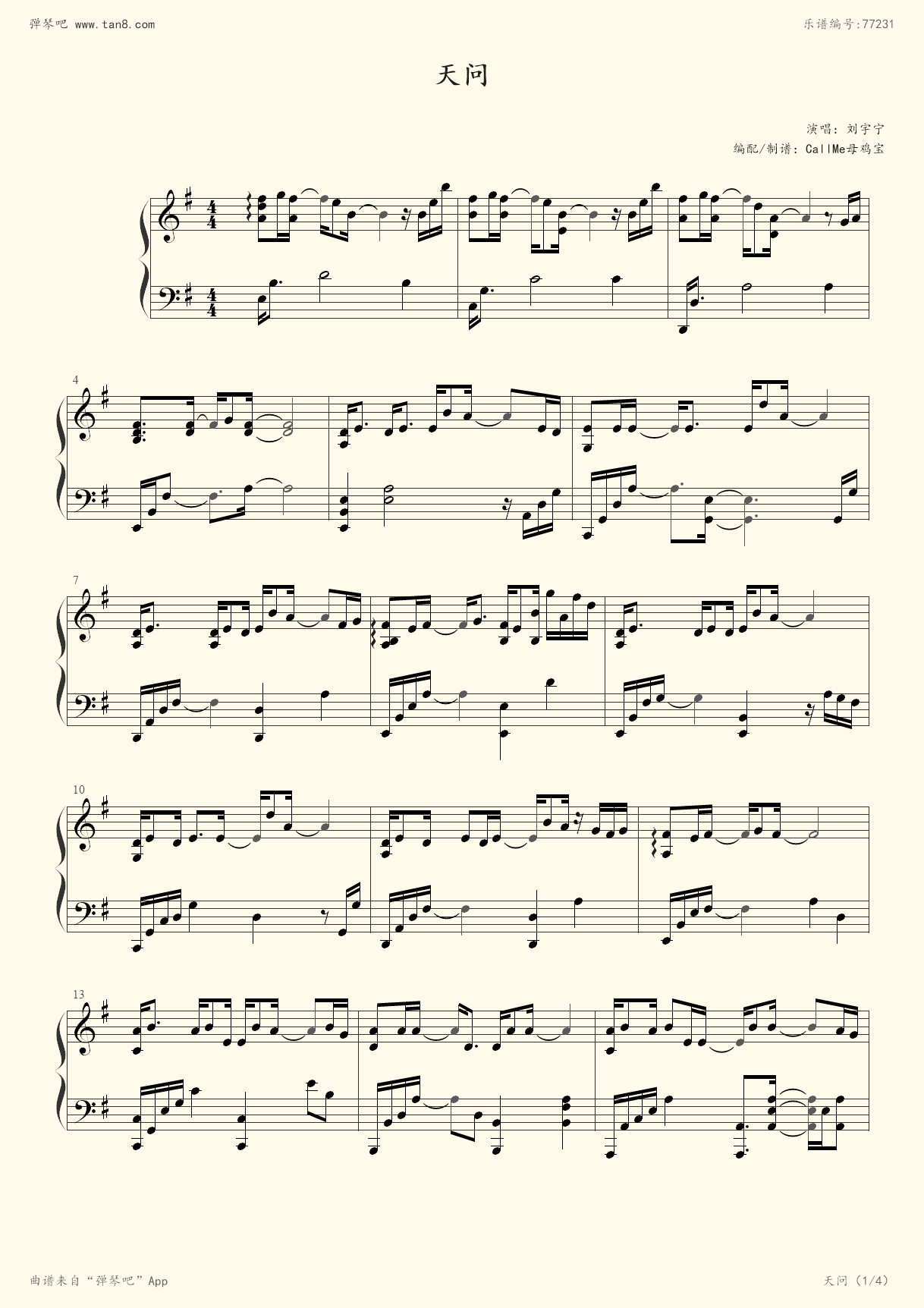天问钢琴谱_刘宇宁_g调 _流行钢琴谱五线谱独奏谱_钢琴谱|钢琴五线谱