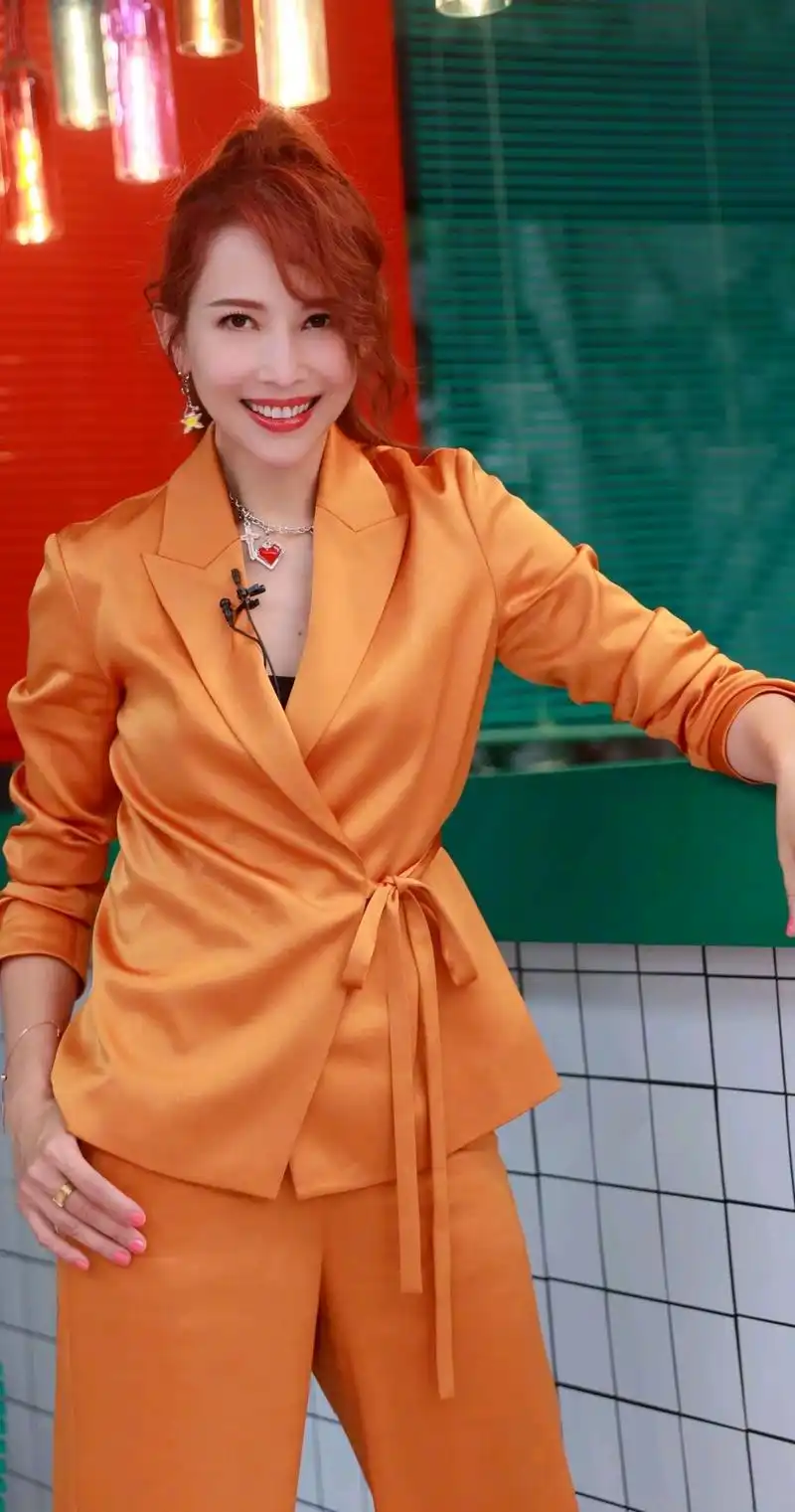 "皇后"蔡少芬47岁染红发,身穿缎面西装气场全开,个性十足