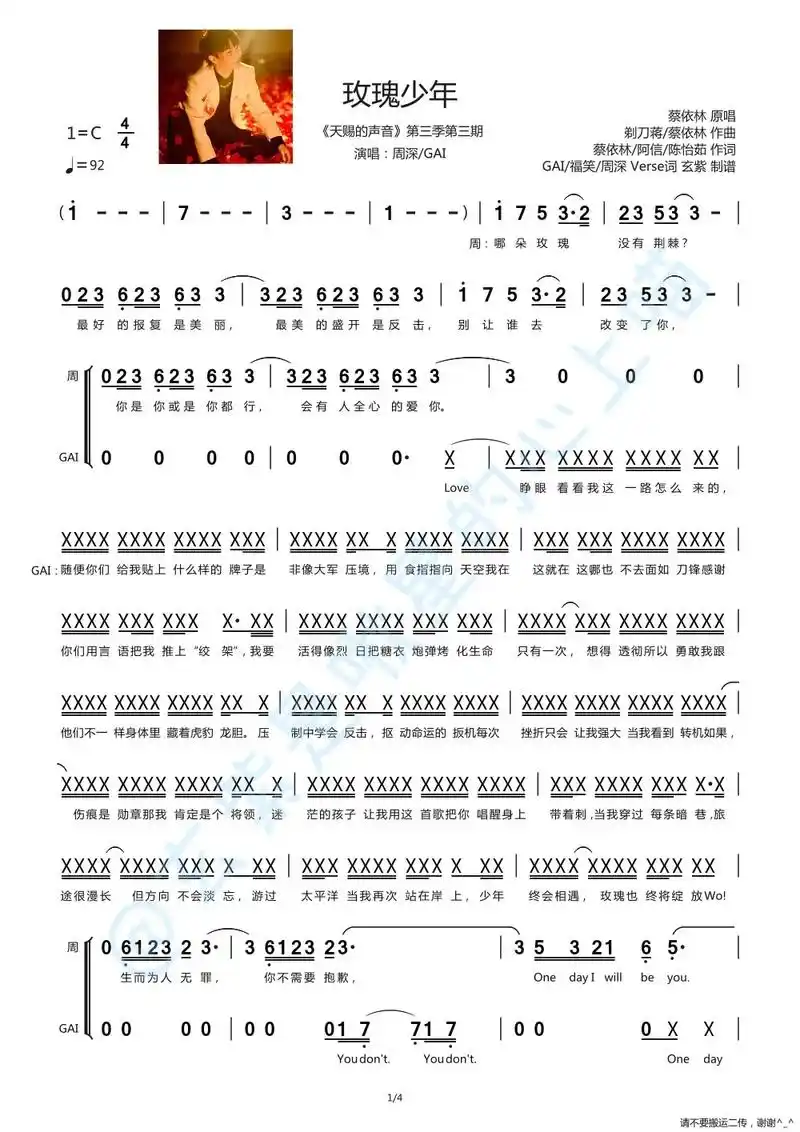 周深/gai《玫瑰少年》简谱.扒谱不易,请不要二次搬运,谢谢 - 抖音