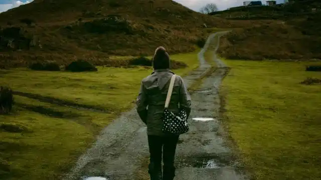 一个穿红夹克的男人独自走在乡间小路上照片