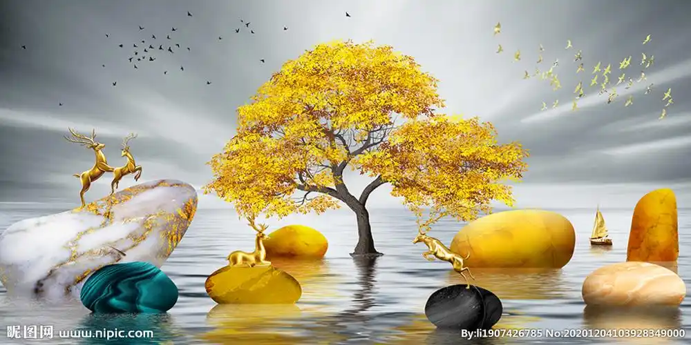 石来运转麋鹿山水抽象晶瓷装饰画图片