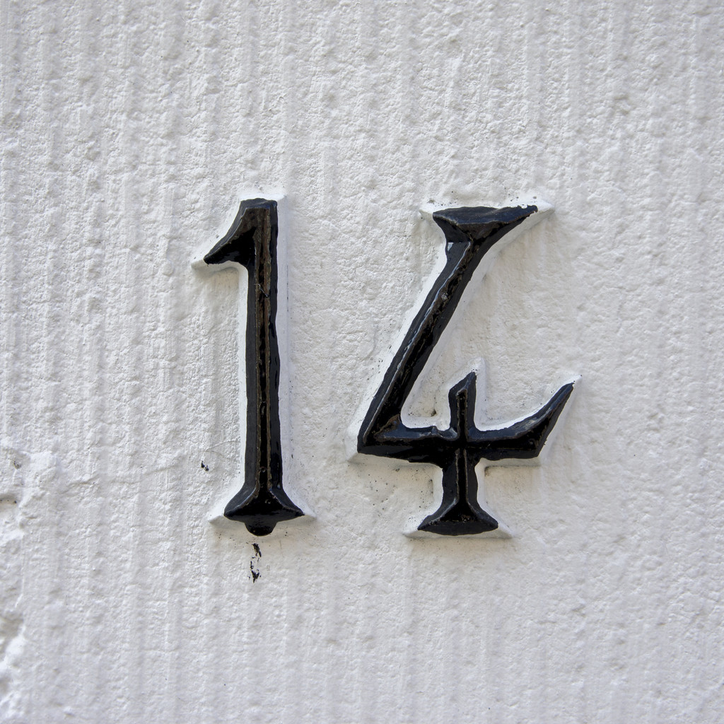 14 号,在白墙上的房子数字十四.