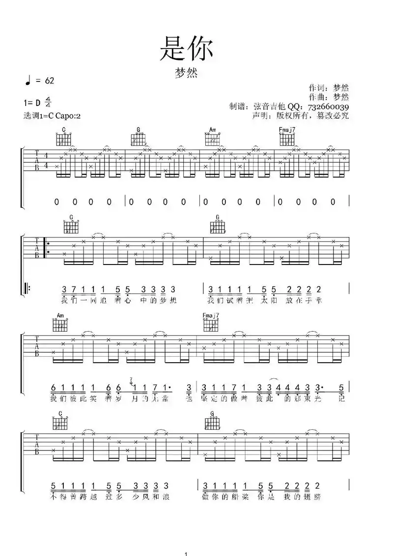 是你吉他谱-梦然-c调原版六线谱-弹唱演示教学