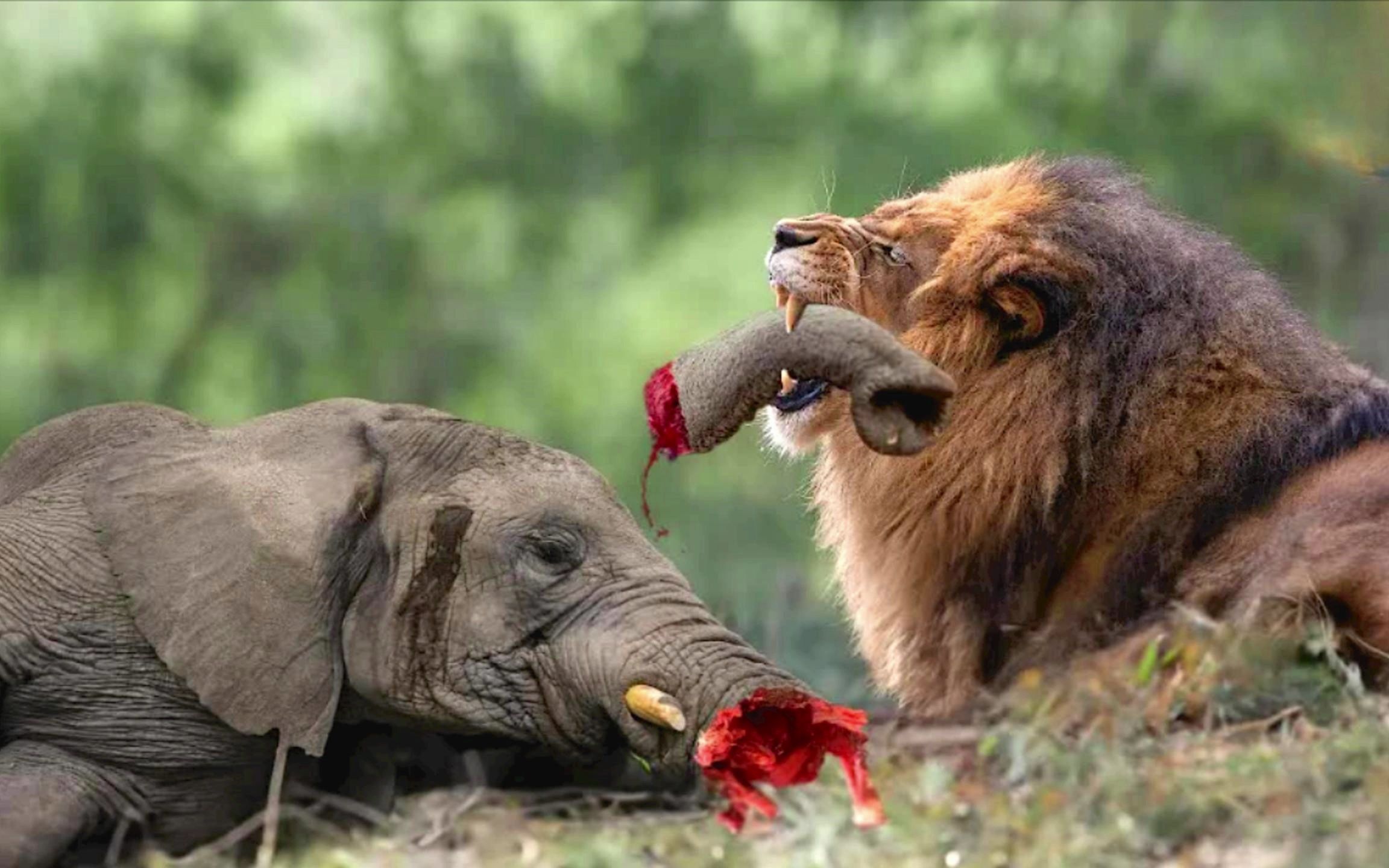大象被狮子咬掉鼻子,并向狮子复仇踩死其幼崽,却惨遭狮群围攻.