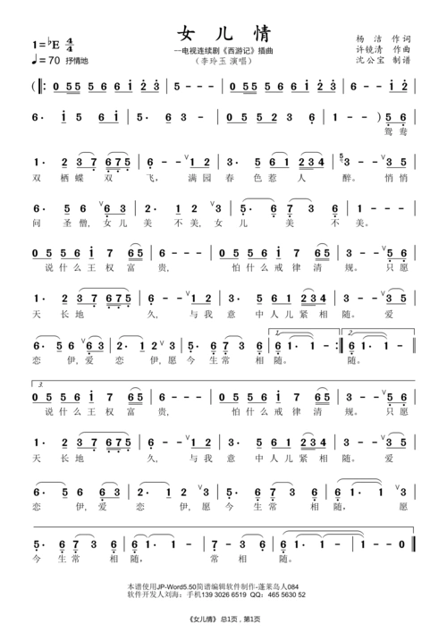 分享曲谱女儿情钢琴谱77简谱西游记插曲