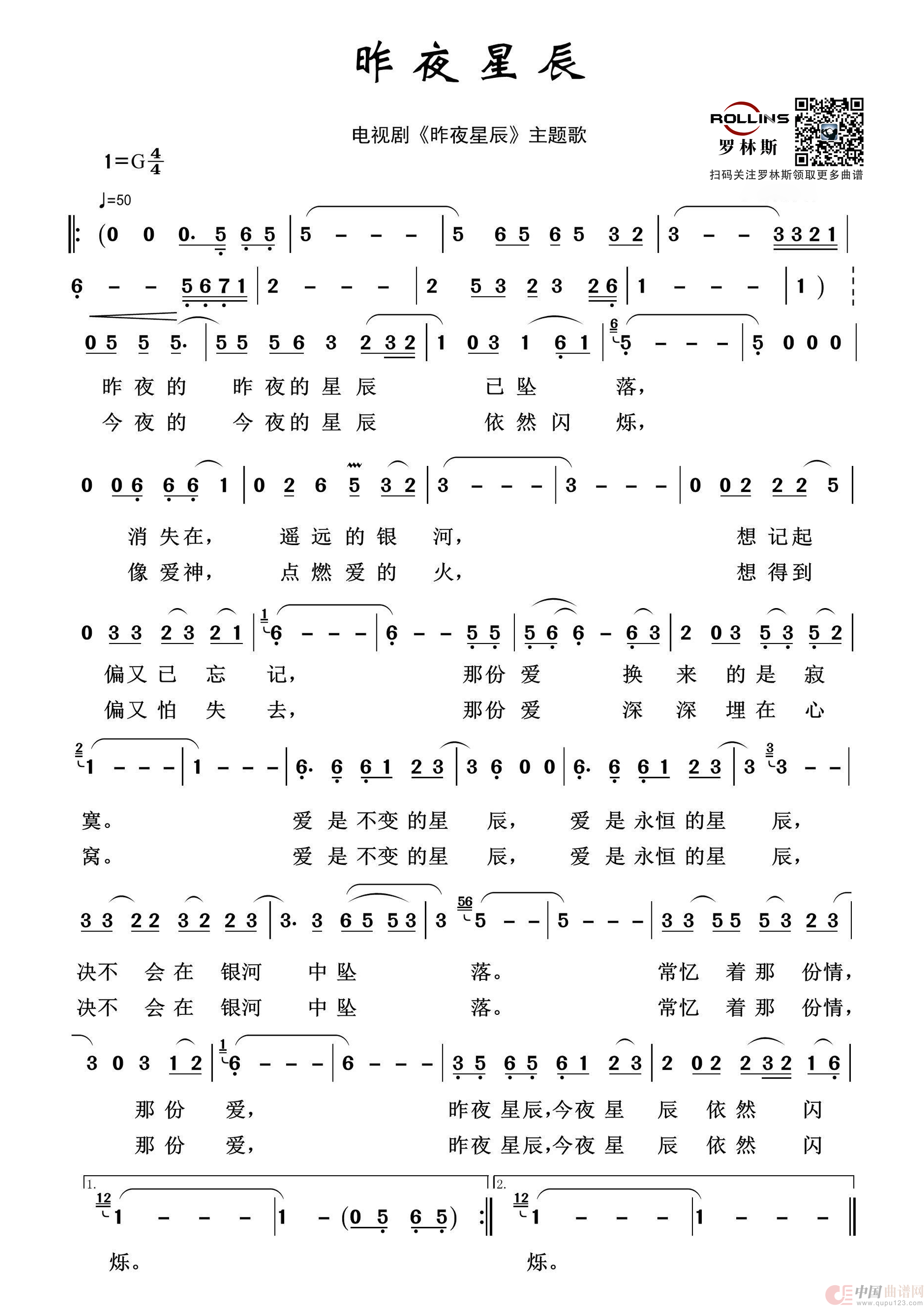 昨夜星辰_简谱_歌谱_曲谱_吉他谱_五线谱