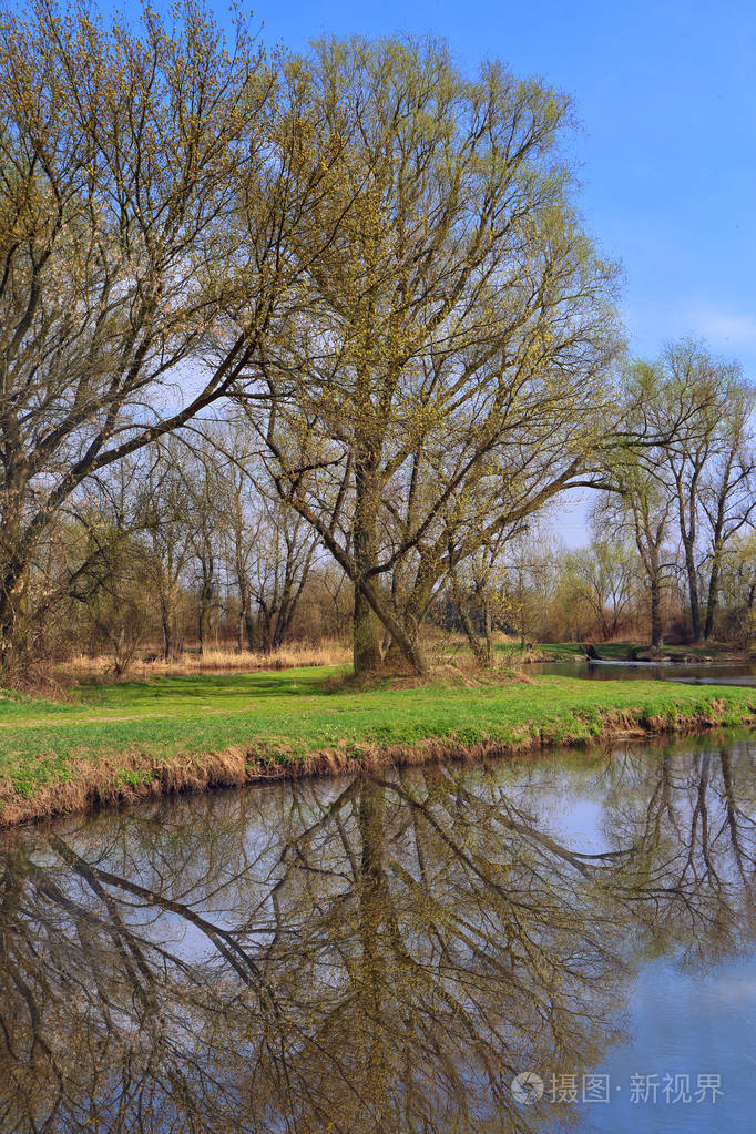 湖中倒影的树的春天观