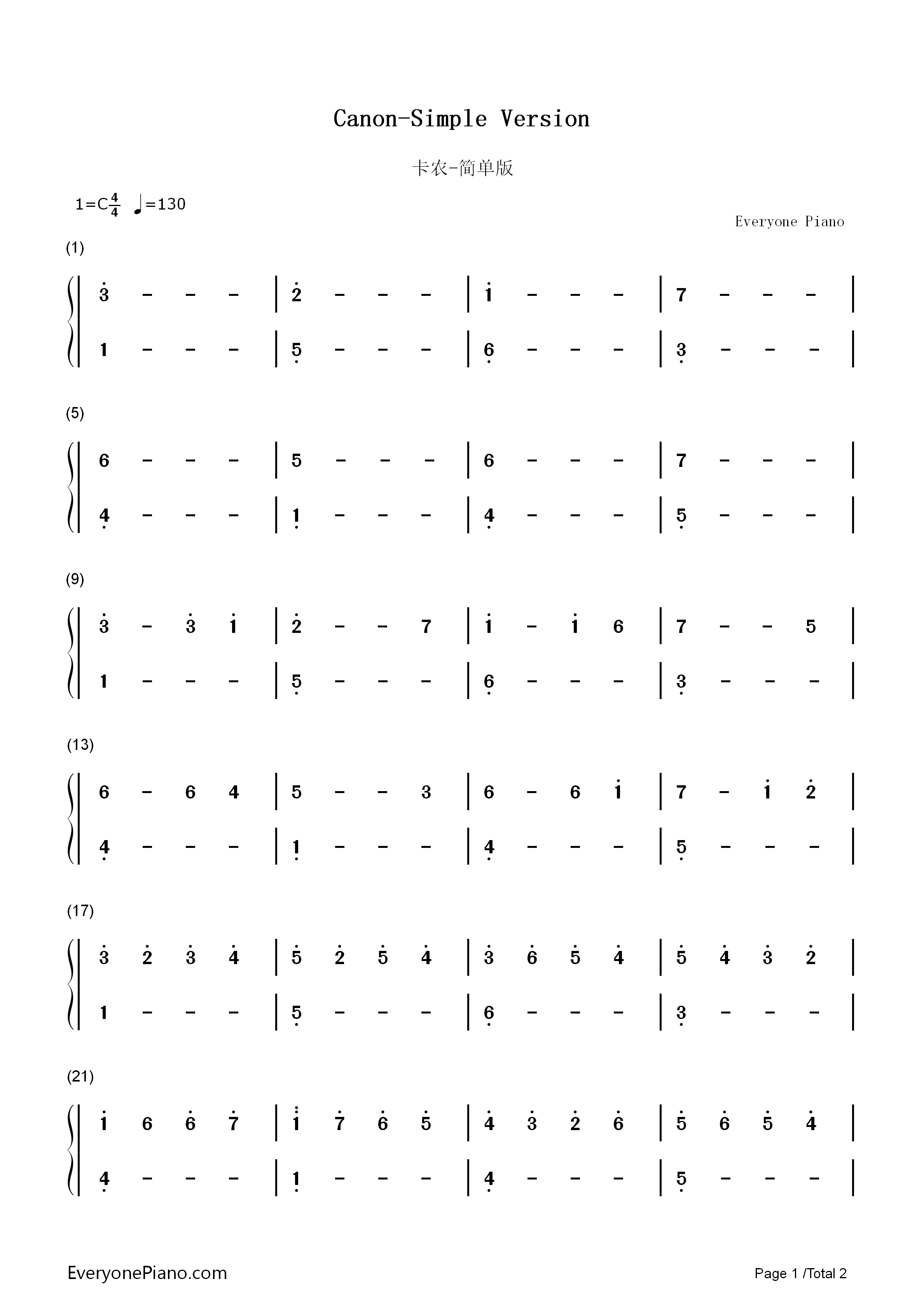 卡农-简单版双手简谱预览1-钢琴谱文件(五线谱,双手简谱,数字谱,midi