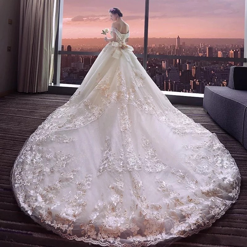 迪拜奢华宫廷超大拖尾婚纱