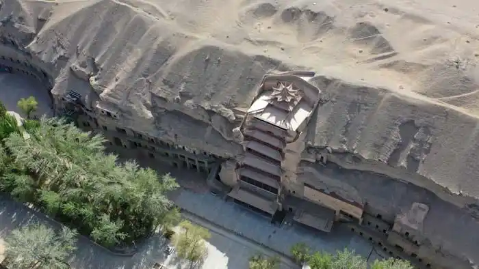 航拍敦煌莫高窟九层楼建筑第七层