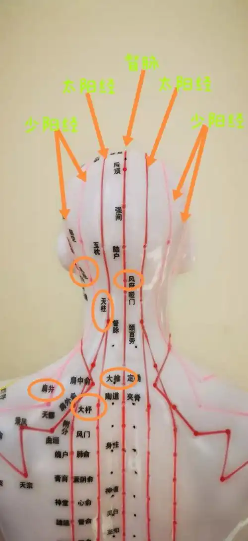 位置会在风府穴到大椎穴;天柱穴到大杼穴;风池穴到肩井穴这三条经络上