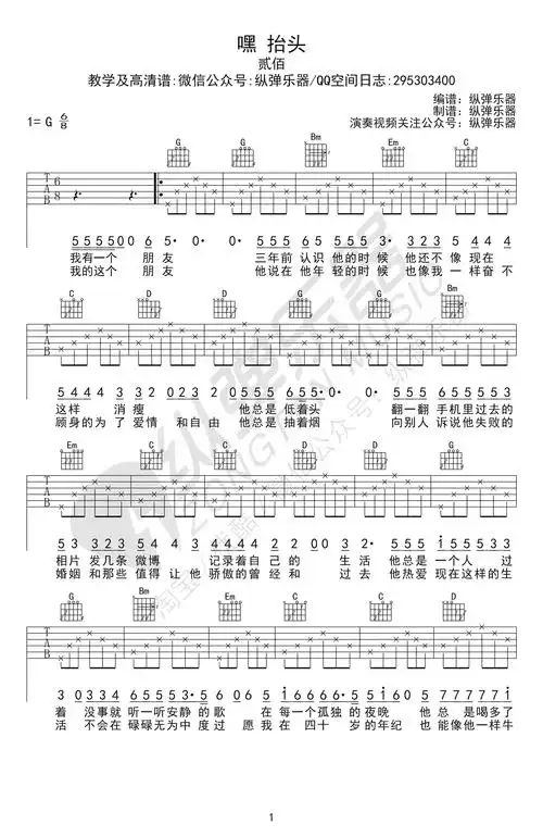 嘿抬头吉他谱贰佰g调六线谱高清版