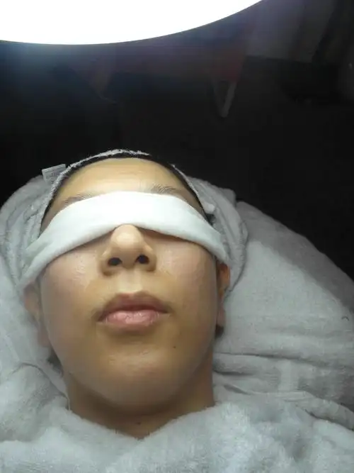 美容师打开灯,开始要清洁粉刺了,将眼部盖上纱布.