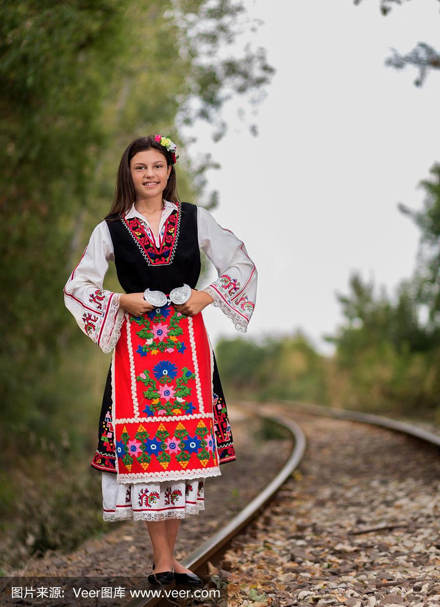 保加利亚传统服装的年轻漂亮的女孩