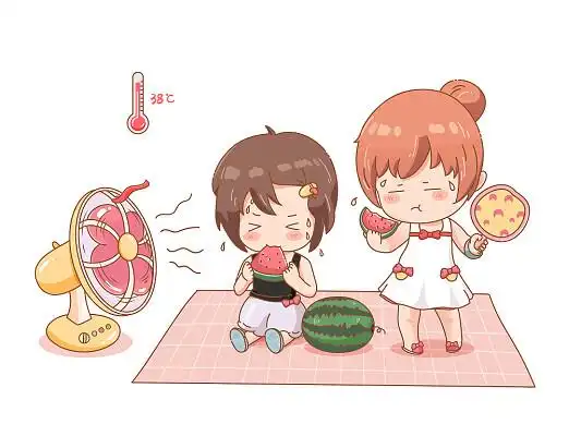 炎热高温卡通女孩吃西瓜扇扇子吹风扇