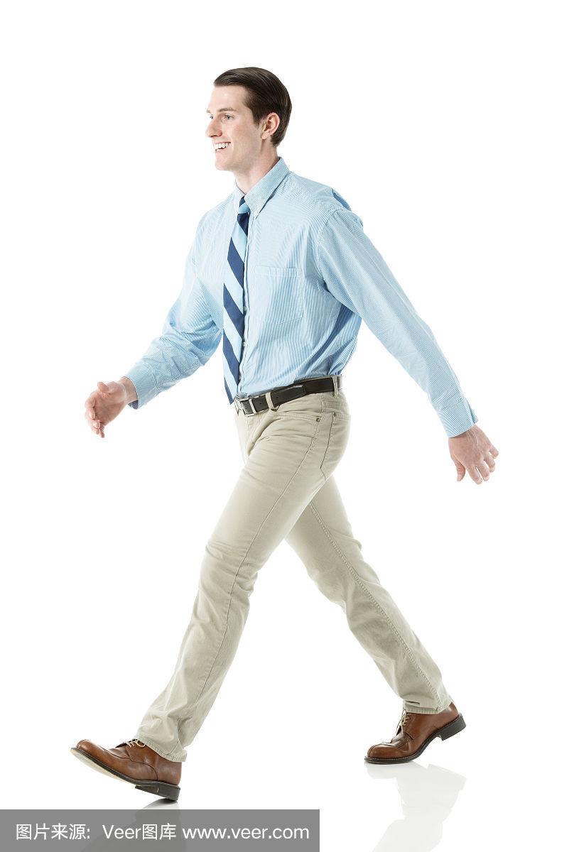 在灰色背景下行走时,一个惊讶的年轻人盯着他,双臂张开