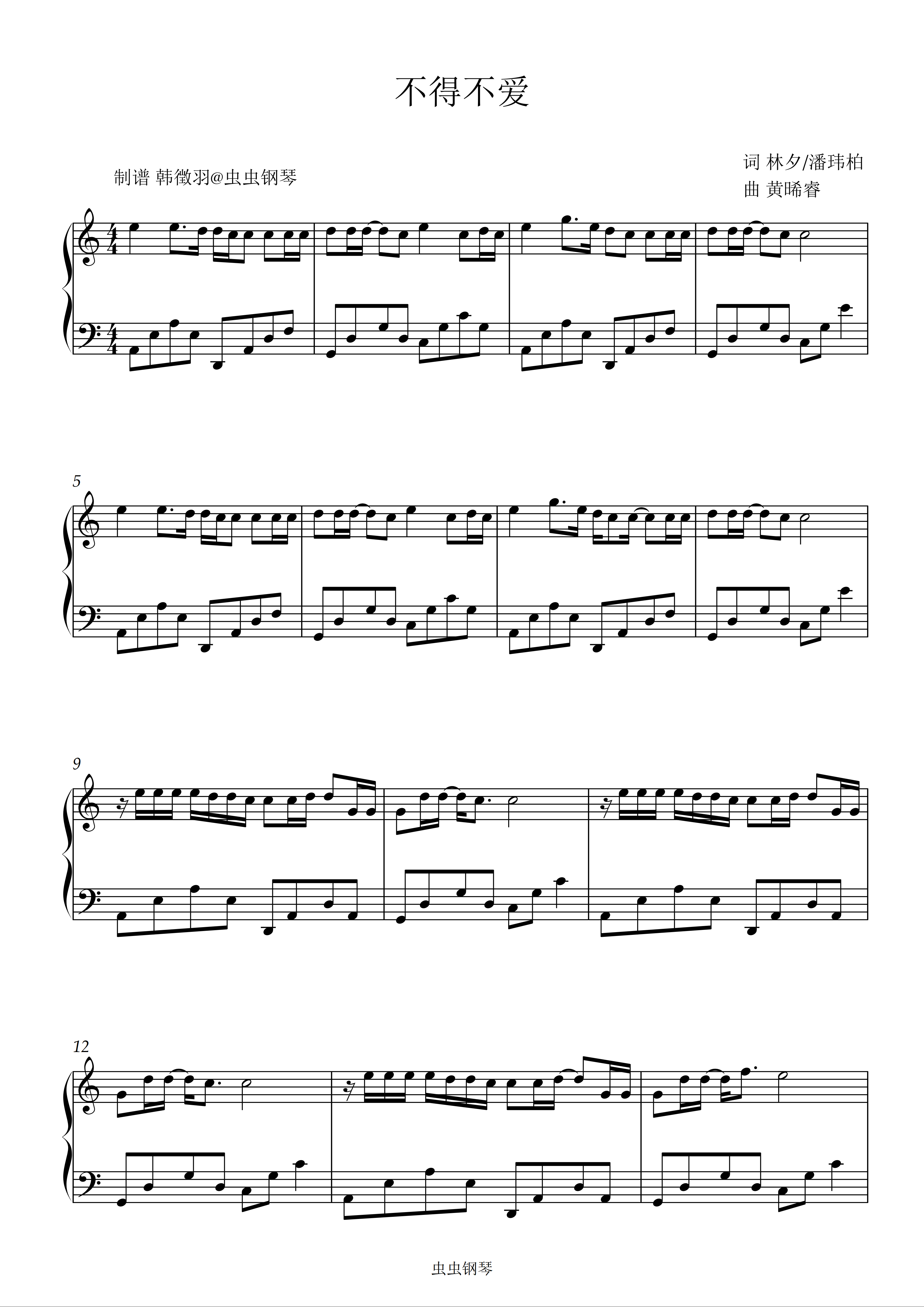 不得不爱钢琴谱-潘玮柏/弦子-c调-虫虫钢琴