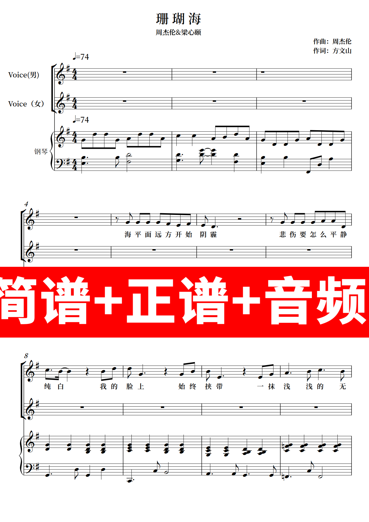 珊瑚海 钢琴谱 伴奏谱 弹唱周杰伦