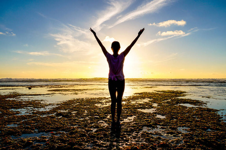 夕阳下的剪影坚强的信心女人张开双臂照片