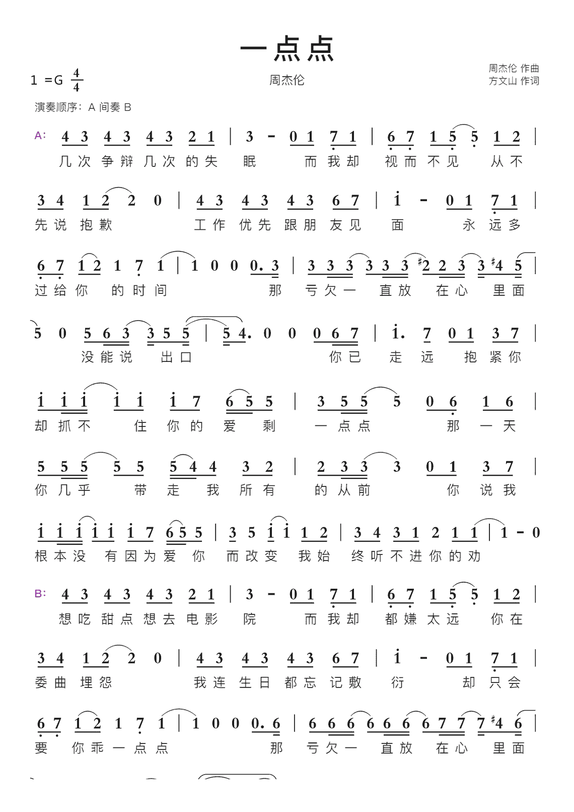 简谱周杰伦jaychou一点点附和弦歌词
