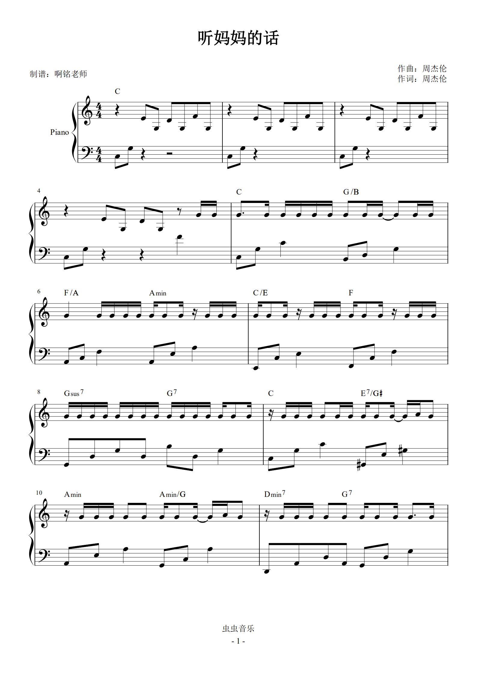 听妈妈的话c调简易原版和弦