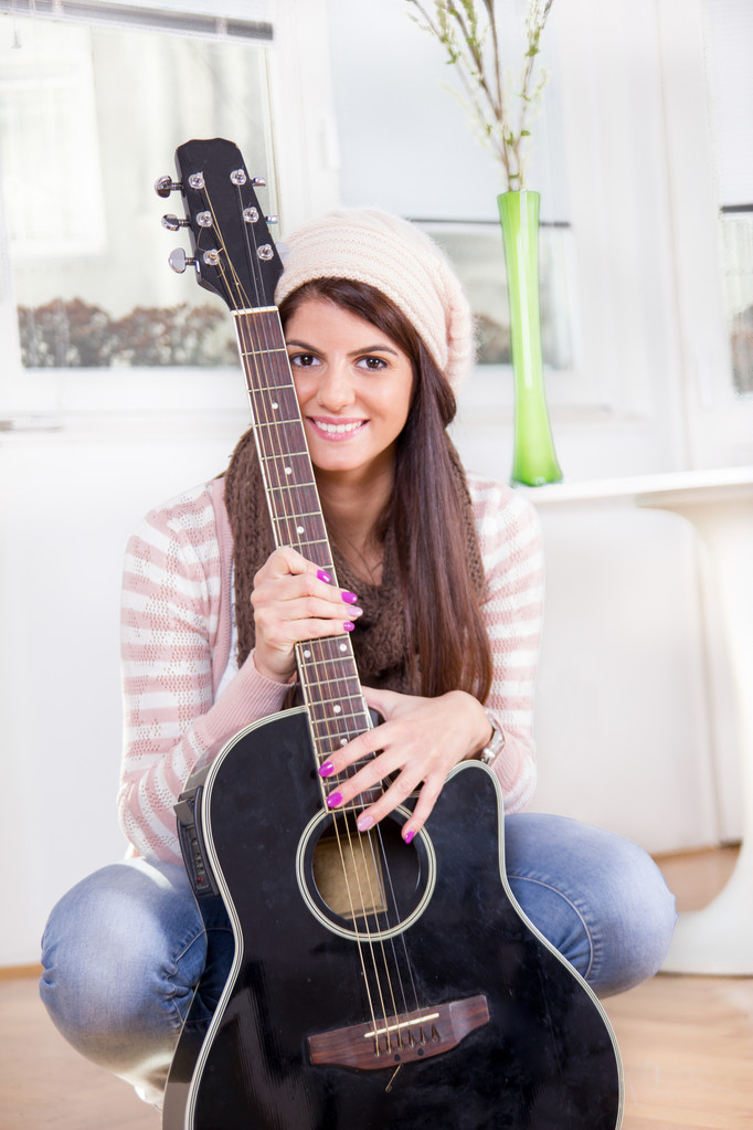 可爱的年轻女孩,抱着吉他