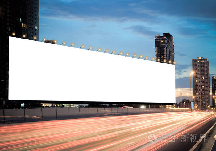 空白广告牌在公路上的黄昏与城市背景与剪裁路径的屏幕.