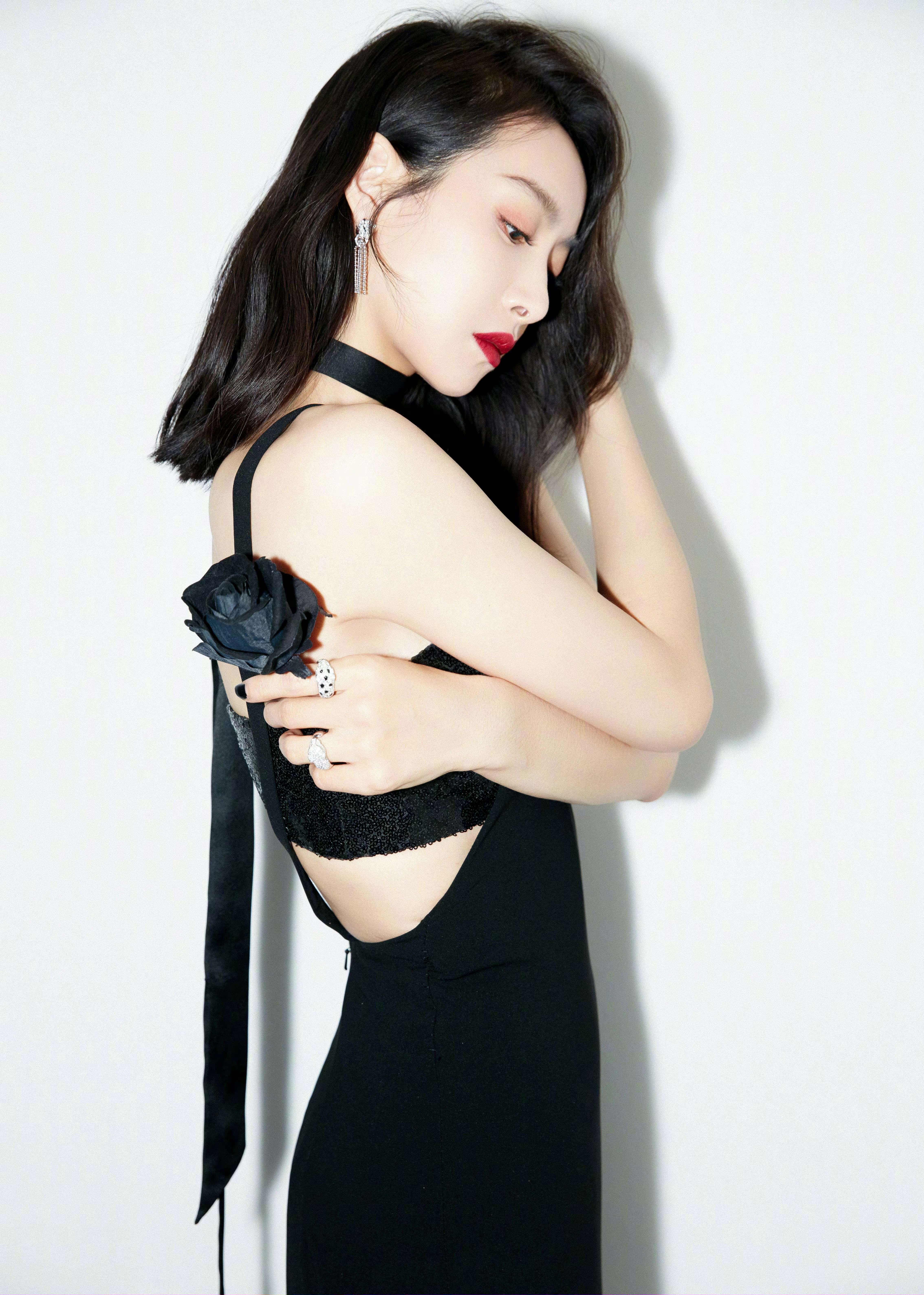 宋茜穿黑色长裙大方秀美背 手拿玫瑰冷艳性感