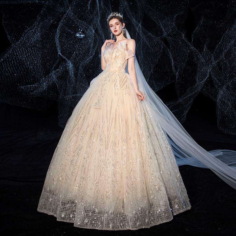 喷金主婚纱新娘结婚礼服高腰白色显瘦长袖婚纱长款拖尾婚纱礼服女