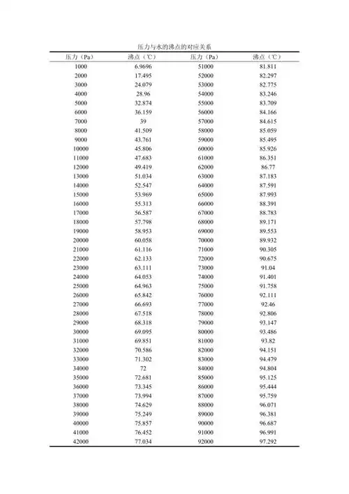1,水在不同压力状态下的沸点对照表 小于一个大气 压 水处理设备及