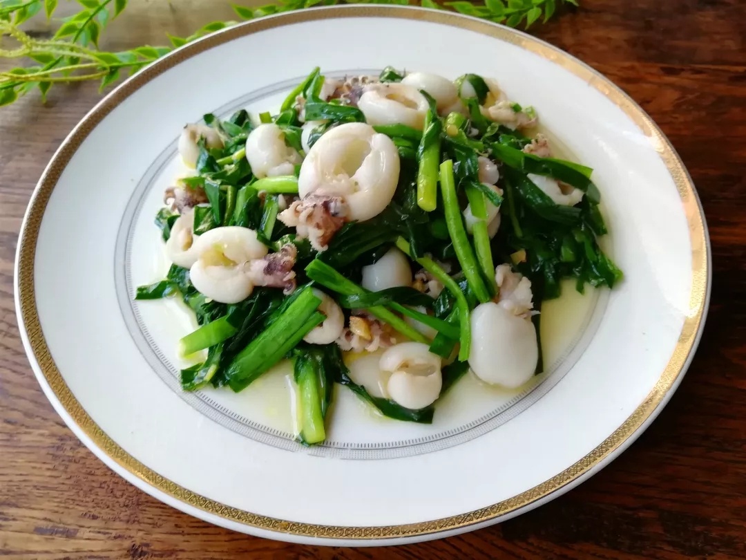 韭菜炒墨鱼韭菜性温养肝护胃滋阴壮阳墨鱼性温健胃益血补肾理气