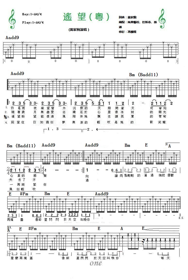 有黄家驹《遥望》这首歌的吉他谱吗?前奏是add9和弦的那个原版的