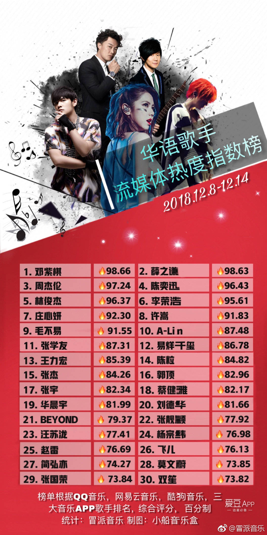 最新华语男歌手热度排名出炉周杰伦第二第一名实至名归