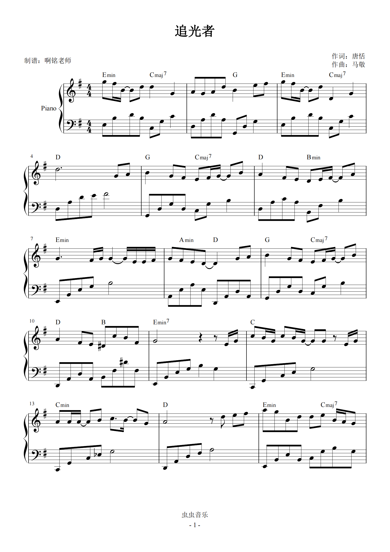 追光者 (完美演奏版)钢琴谱-c调-虫虫钢琴