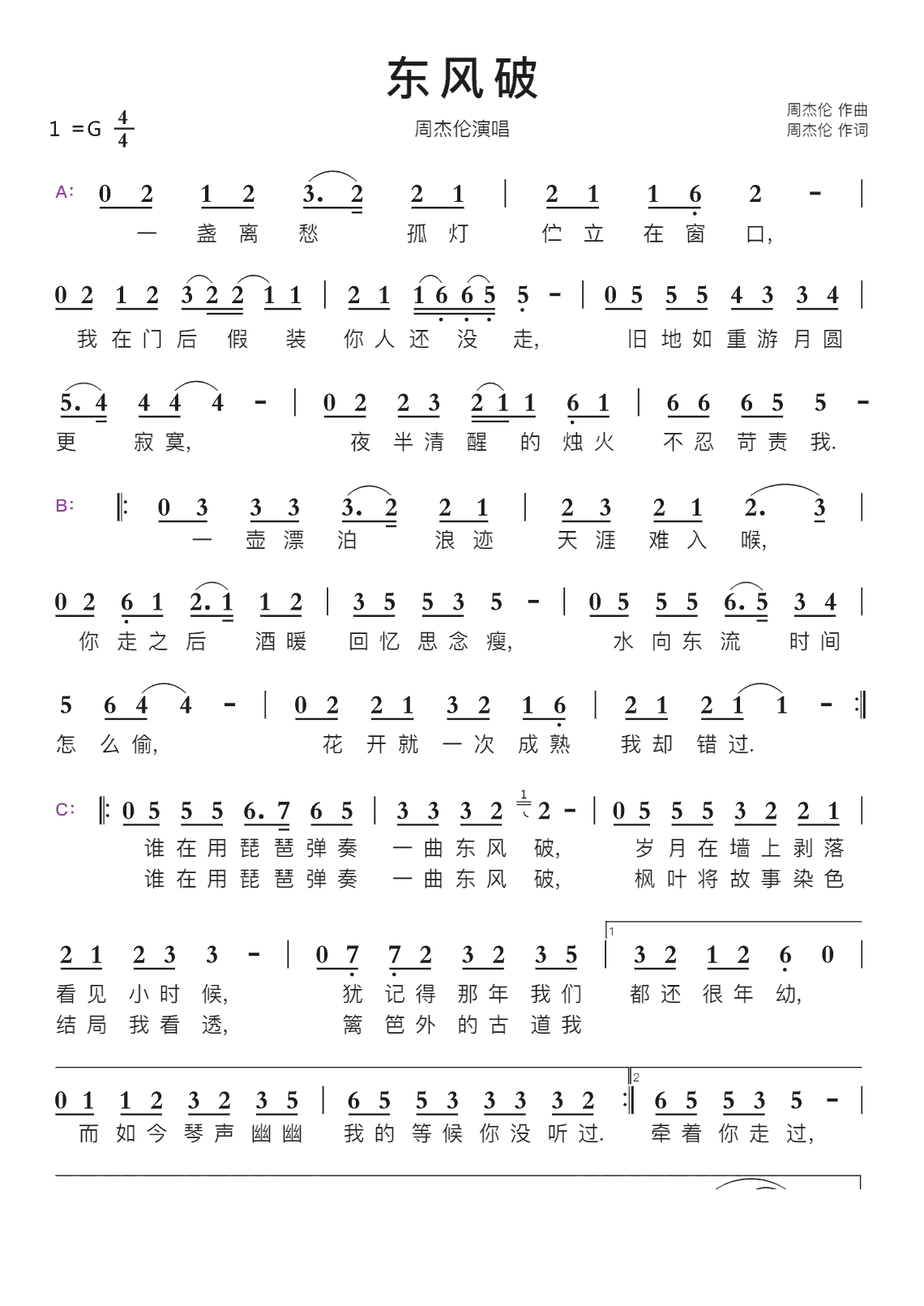 东风破简谱(歌词)_周杰伦演唱_z.e.z.制作