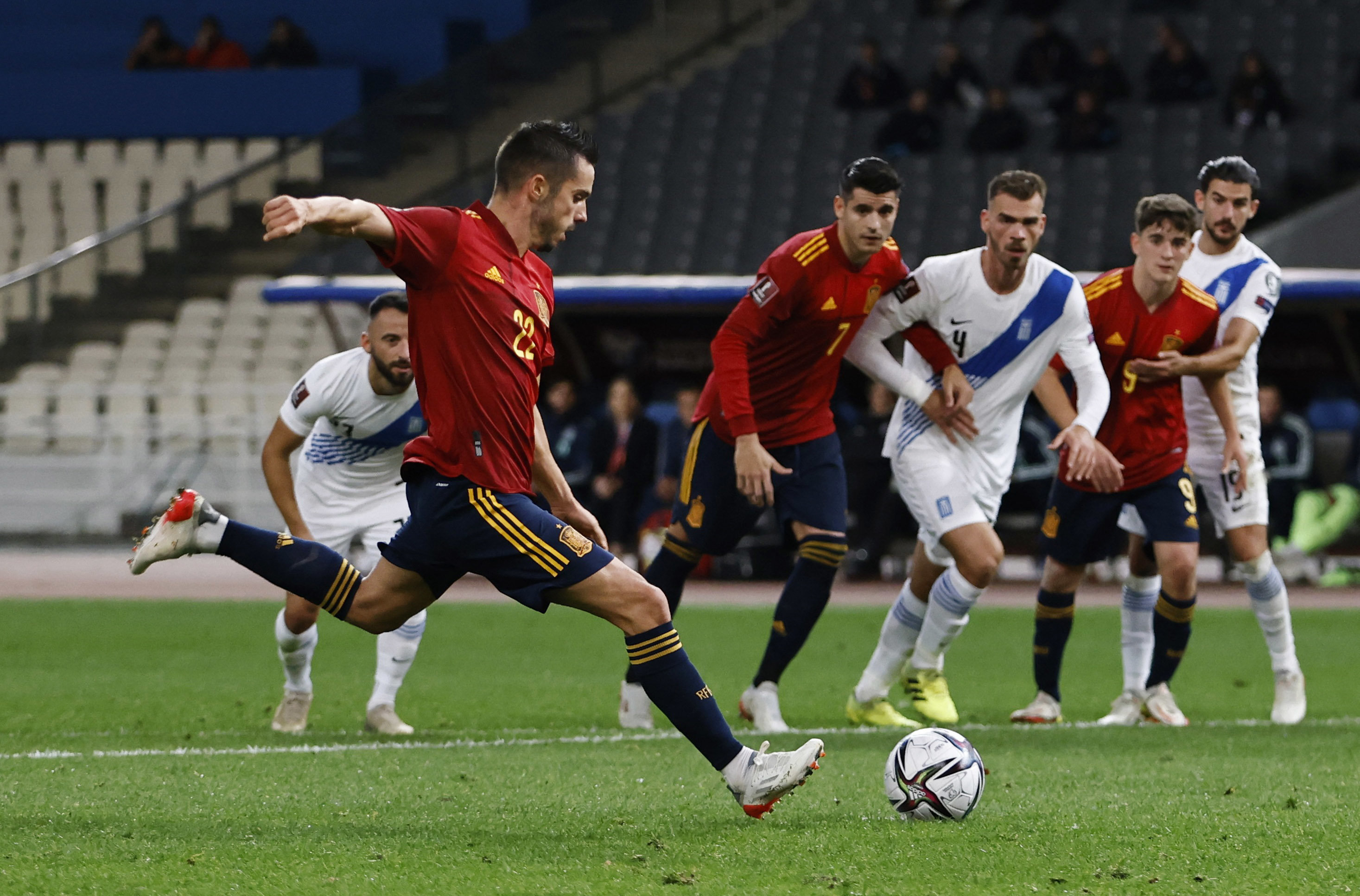 2021年11月11日,西班牙队球员萨拉比亚(左)在卡塔尔世界杯预选赛对阵