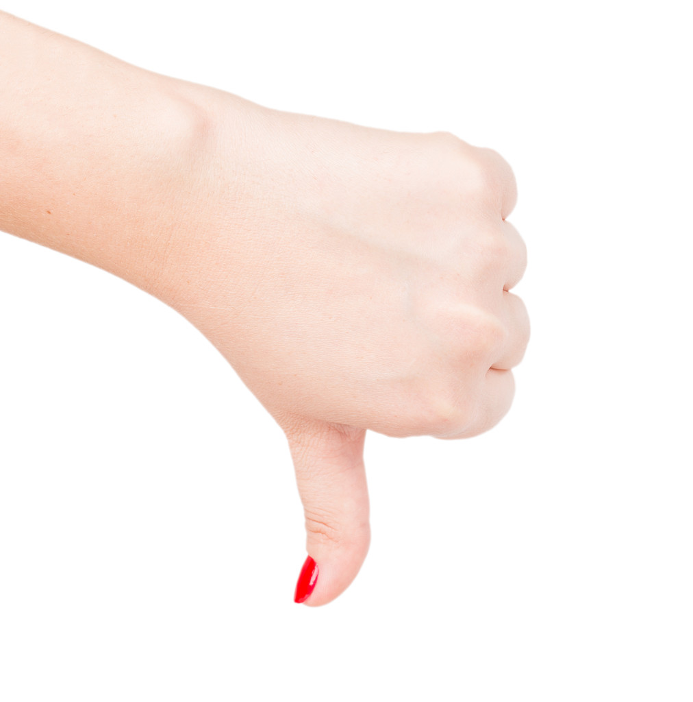 女性手在白色背景下显示拇指向下手势