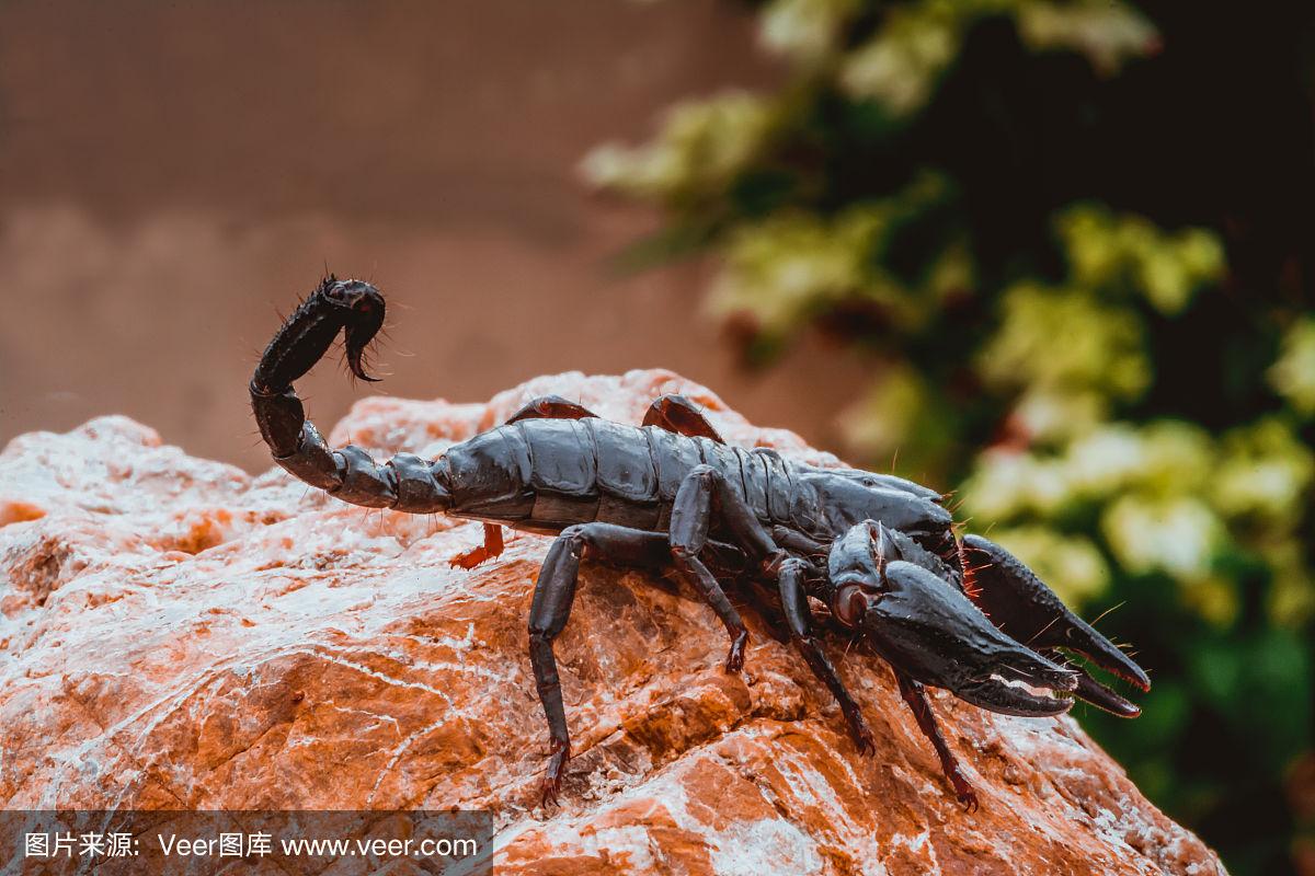 一只黑蝎子在自然界的野生动物生活在森林的大石头上