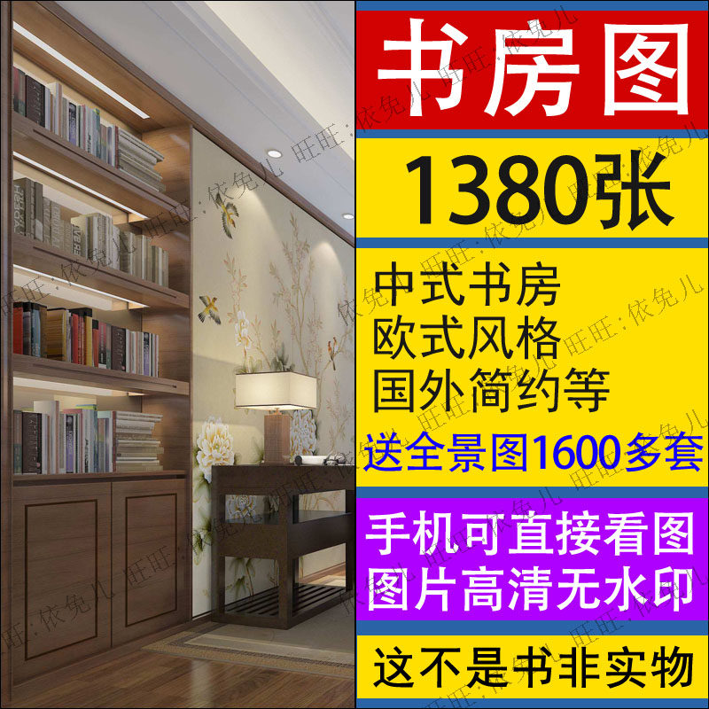 家装室内欧式中式书房装修设计效果图现代简约书桌柜子书柜图书房