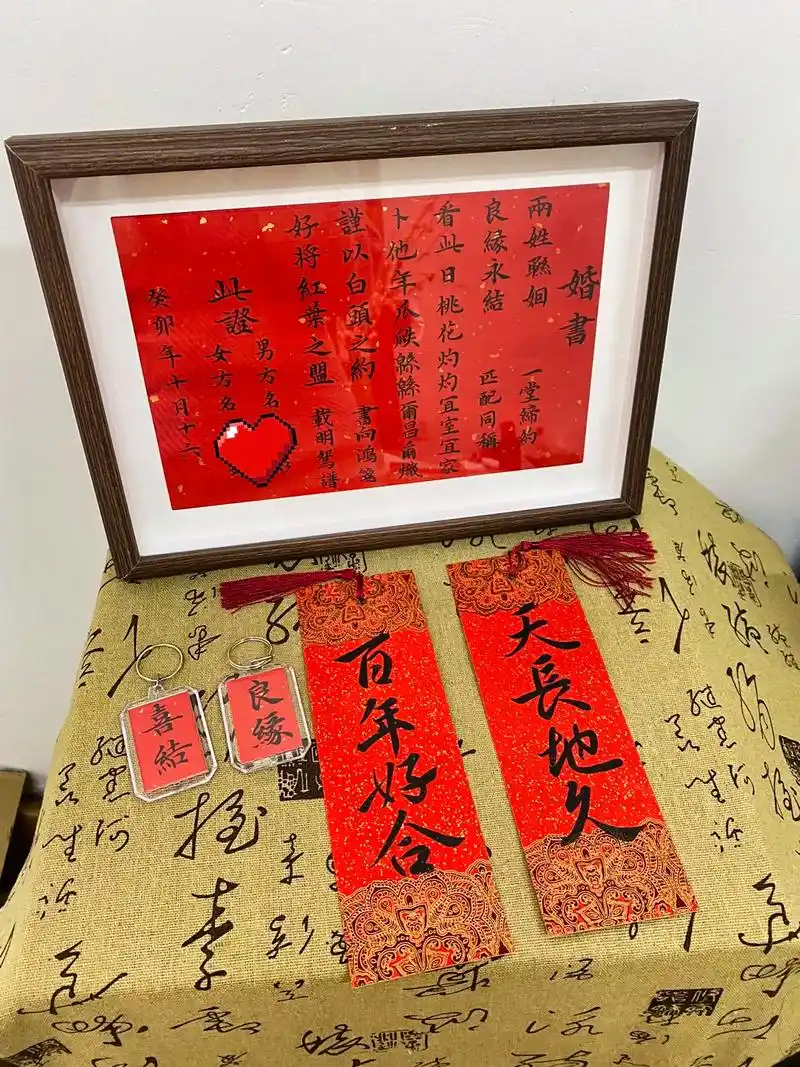婚书 今朝赤绳系定,琴瑟和鸣 谨愿白首永偕,共盟鸳誓 诚祈四序风月