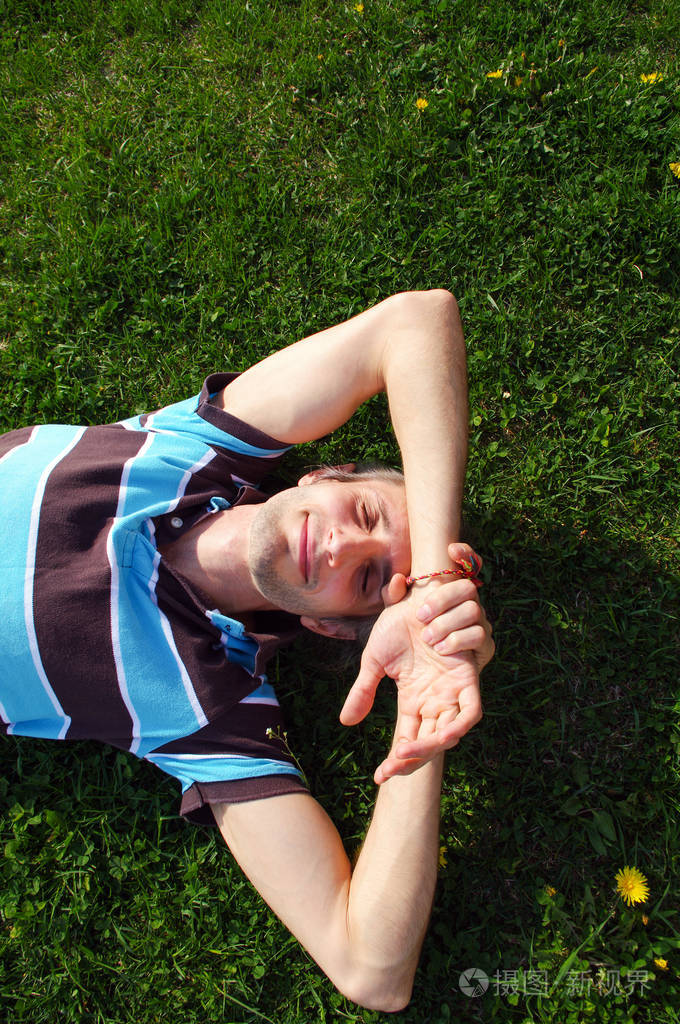 一个年轻人快乐轻松的用手在头下的草地上的肖像照片-正版商用图片0