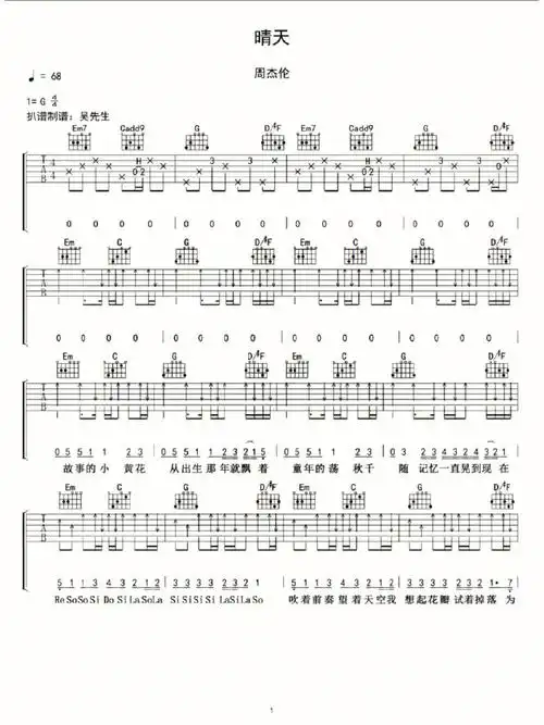 周杰伦晴天吉他谱g调吉他独奏谱简单版